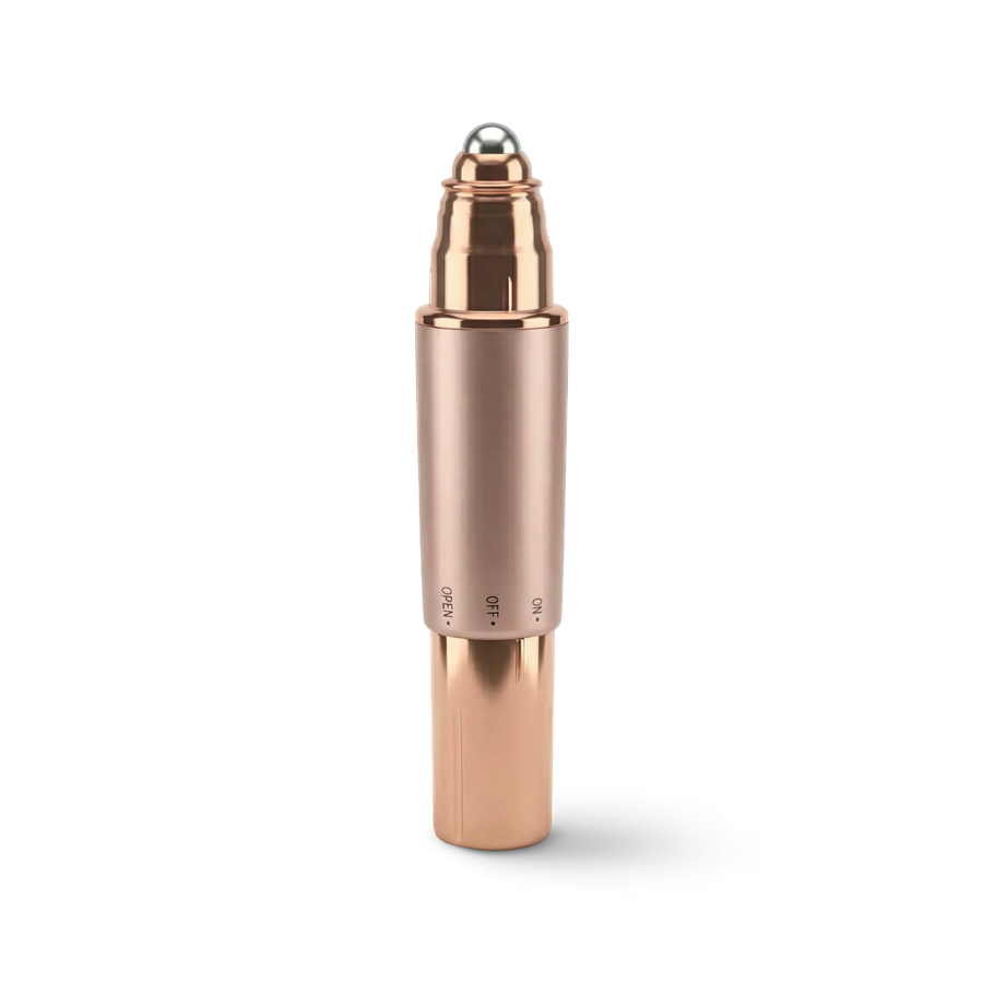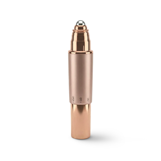 Kompaktowy masażer do okolic oczu łączy chłodzącą końcówkę i delikatne wibracje soniczne, wspierając aplikację ulubionych kosmetyków.
